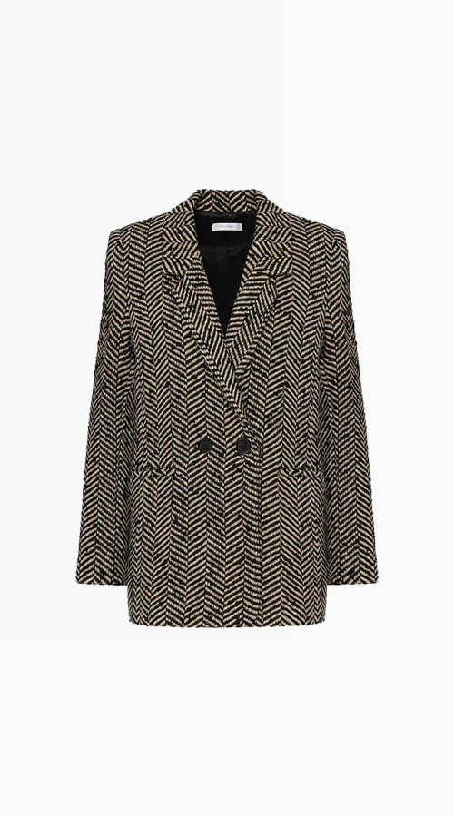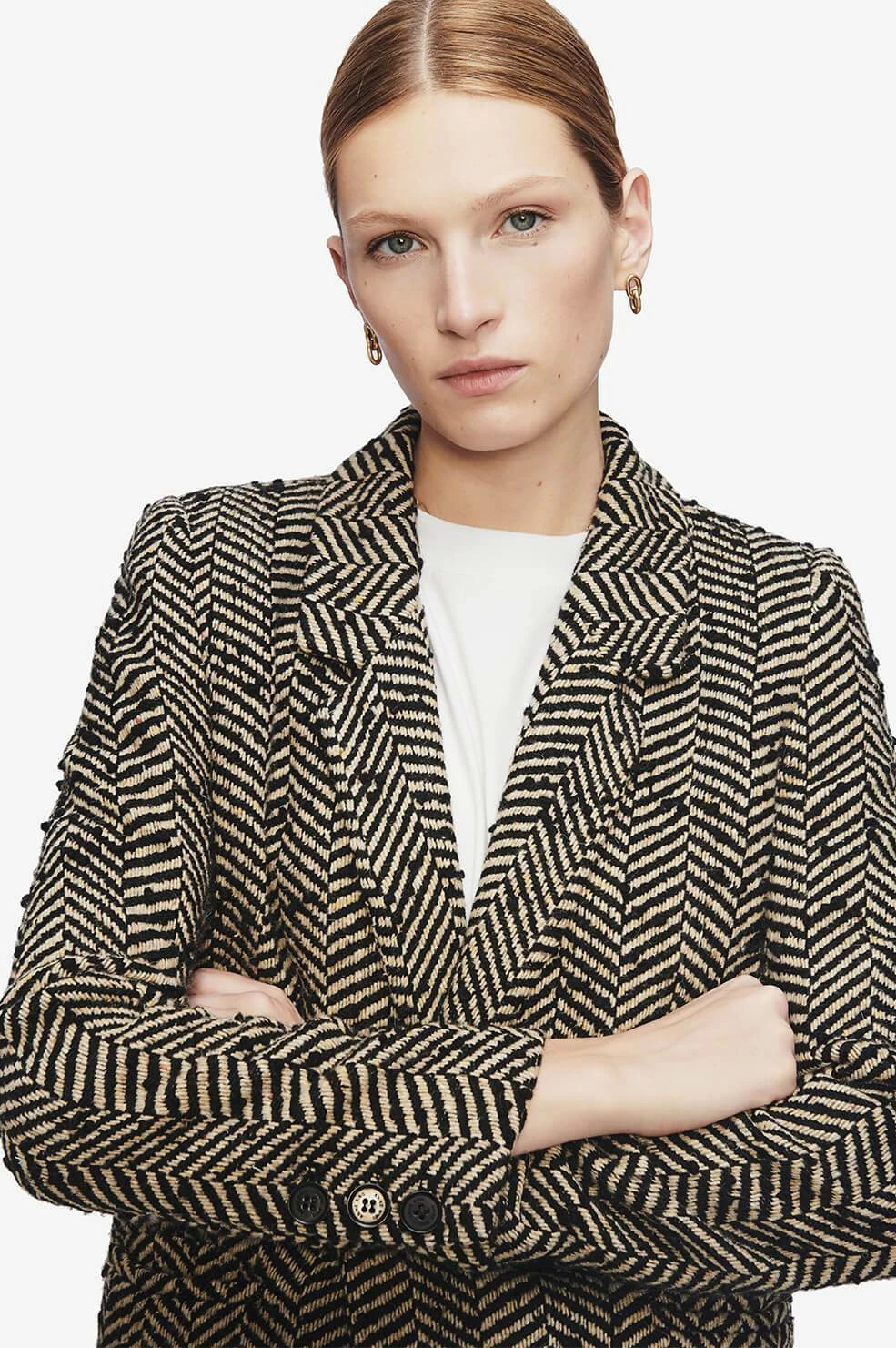 The Anine Bing Fishbone Blazer in Cream and Black is a true wardrobe staple, updated in a new color combination for spring. This classic menswear-inspired blazer is constructed from a luxurious Italian wool blend and features a textured fishbone pattern in cream and black. Cream and black colourway Menswear-inspired b
