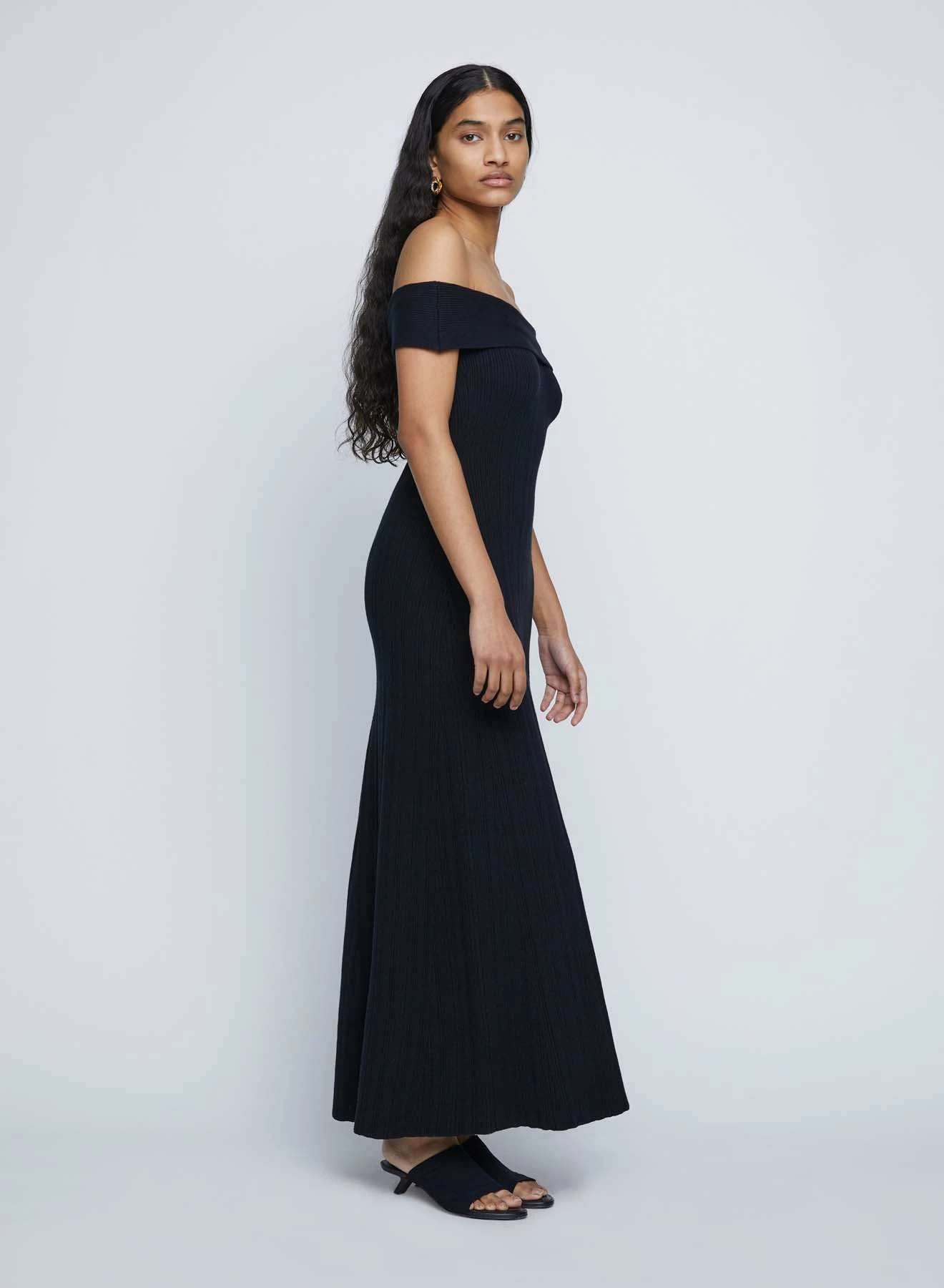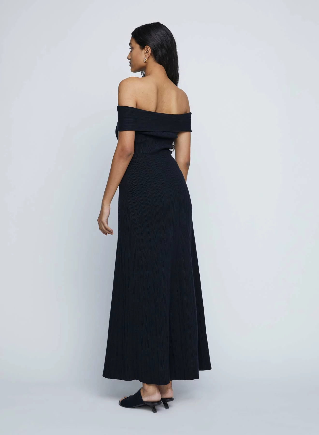 The Anna Quan Neve Dress in Raven is a timeless addition that can easily be taken from day to night. Elegance starts with the simple design and thoughtful fabrications. This off-the-shoulder dress is knitted in a soft, luxurious, and flexible cotton blend. That is finely ribbed for a smooth and flattering fit over the