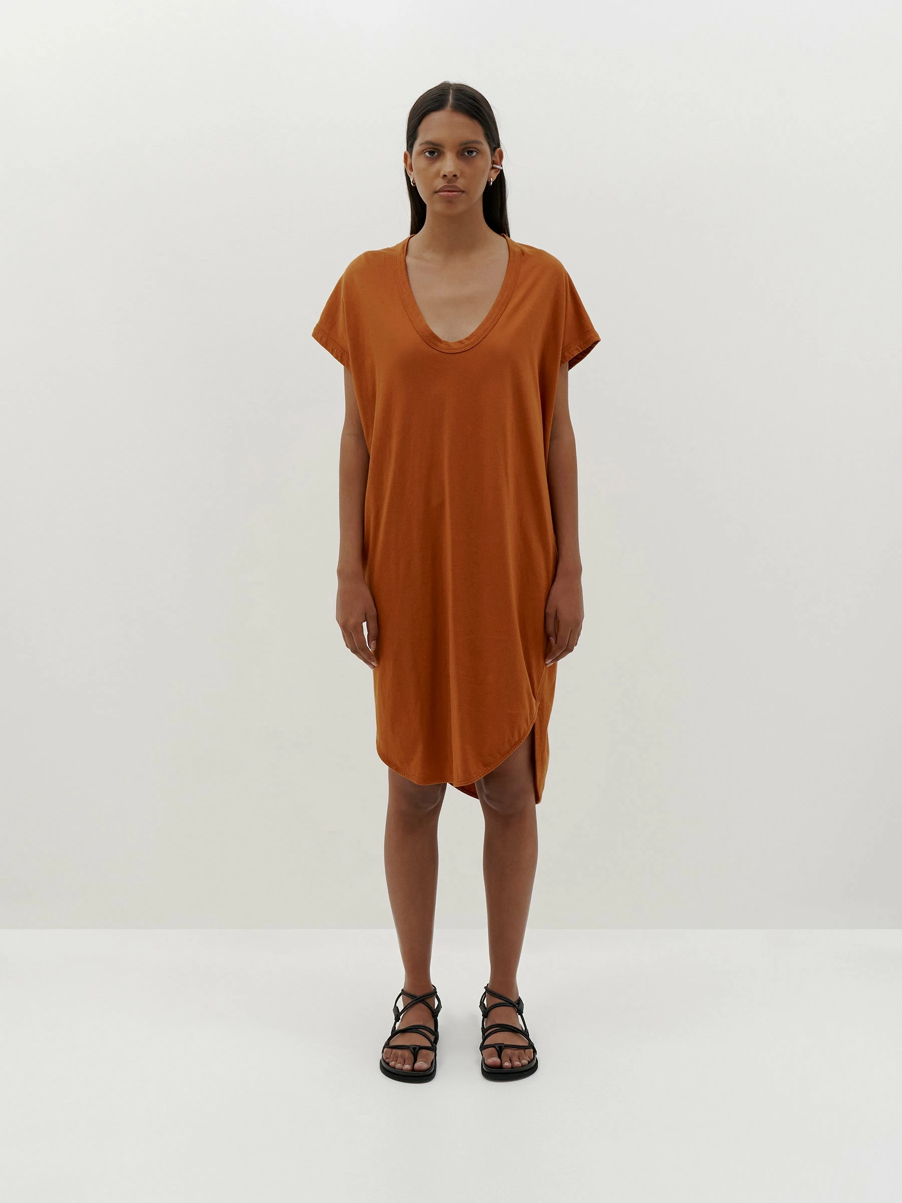 The Bassike Boxy T.Shirt Dress in Orange Rust is a bold and fashionable option for your summer wardrobe. Featuring a scoop neckline and a loose fit that provides a relaxed, effortless look. The dress is made of a lightweight and soft cotton jersey. The rust orange color is a rich and warm hue that adds a pop of color t