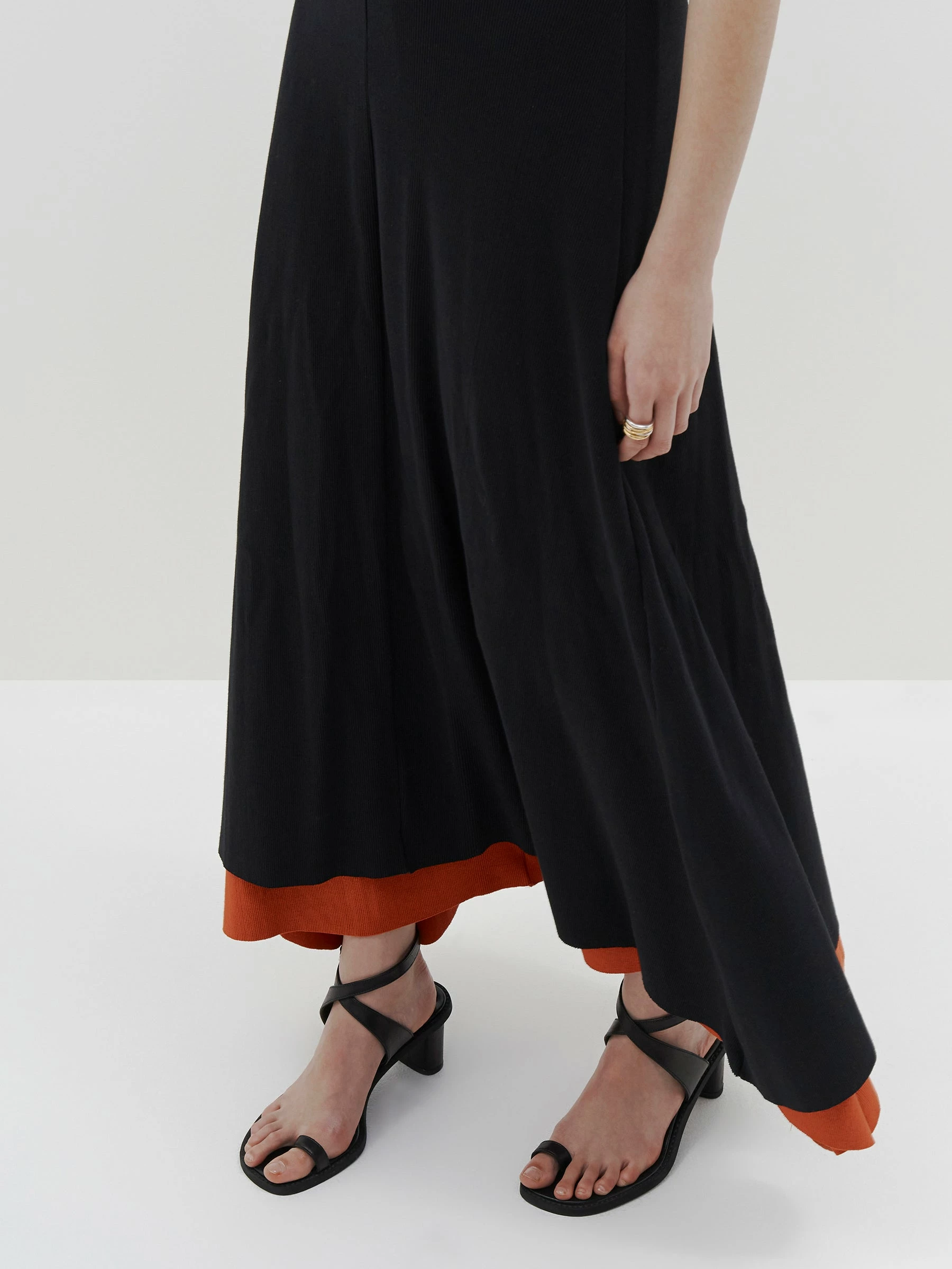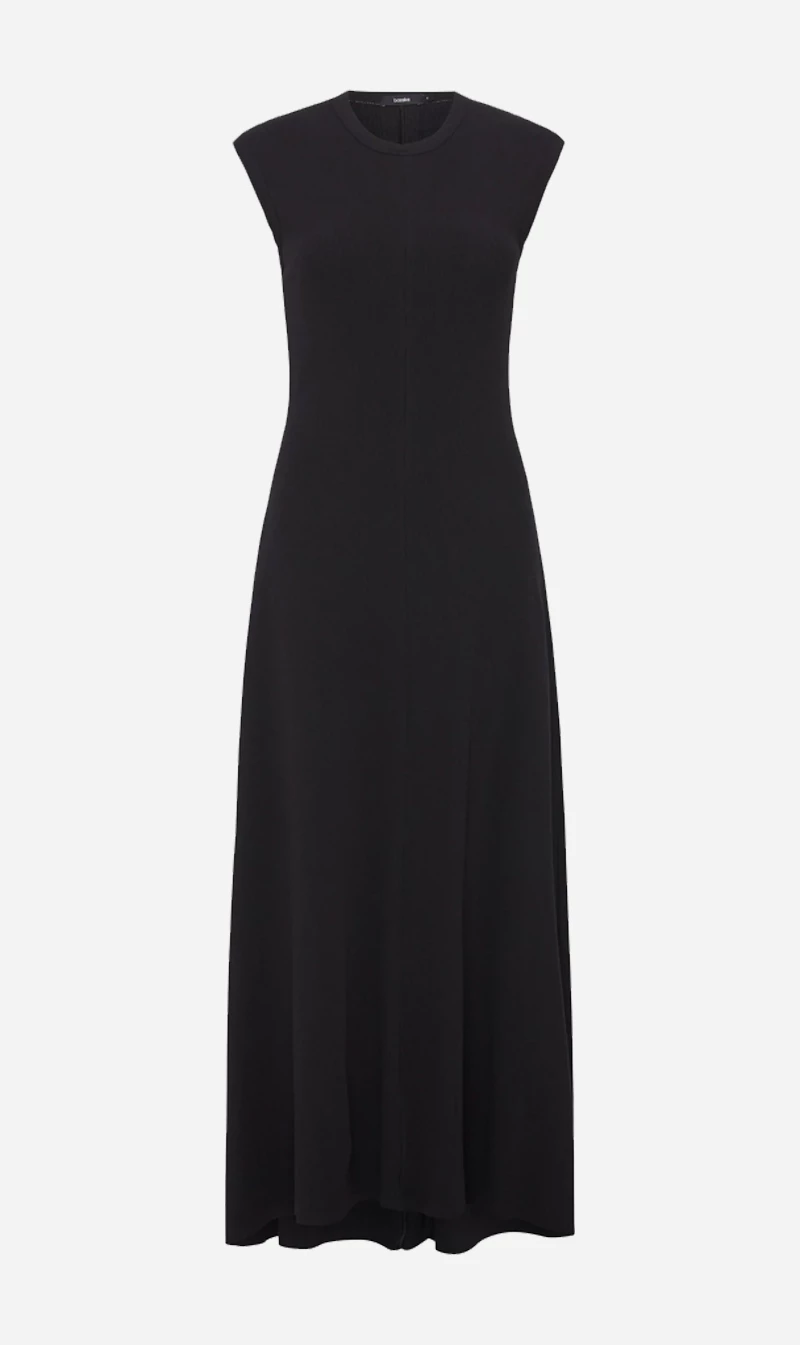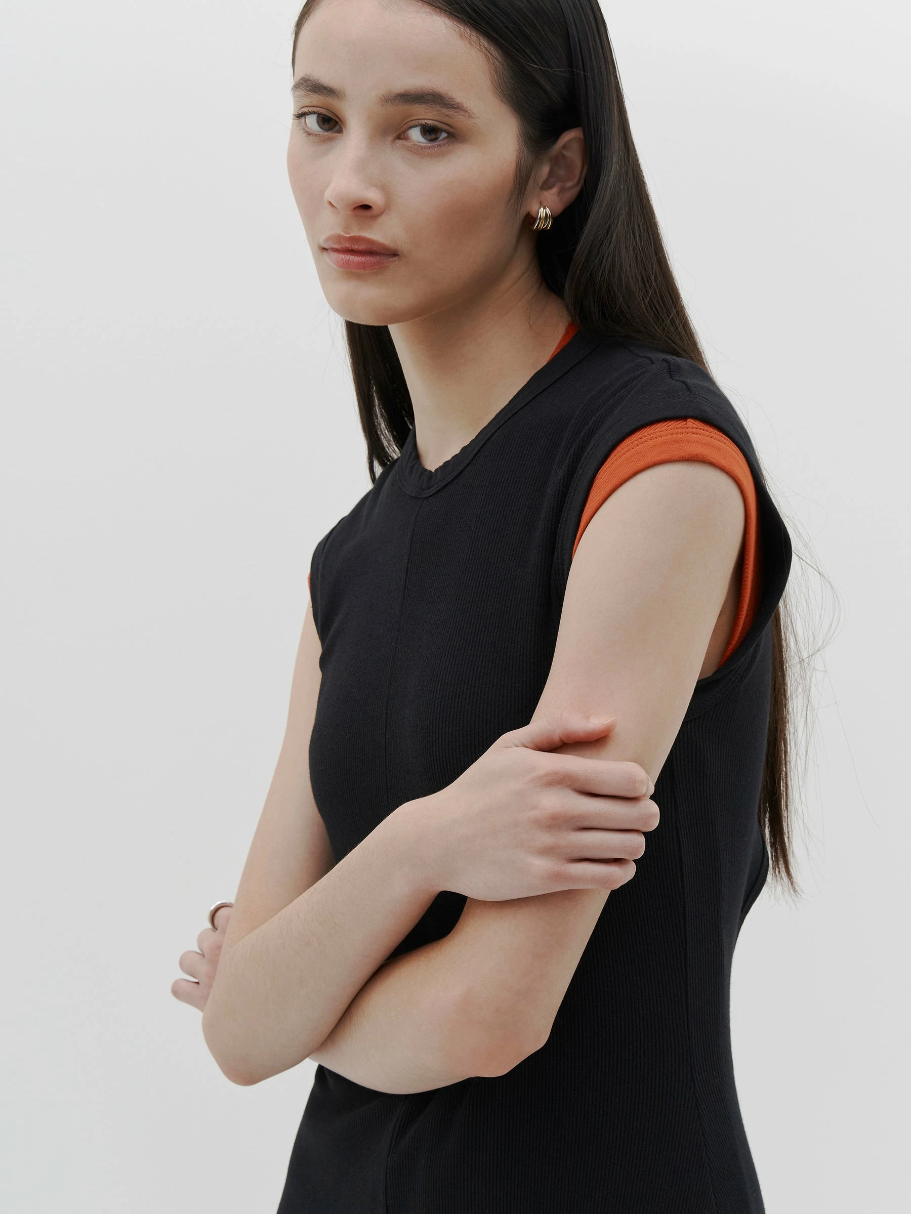 Simple and chic, the Open Back Muscle Tank Dress is an elegant, a-line over the shoulder tank dress in cotton blend mini rib. Featuring lower back cut out and raw edge hem, pair with a simple slide and layer with an open linen shirt. Maxi Length Cotton Blend Mini Rib Lower Back cut out Raw Hem cotton spandex mini rib