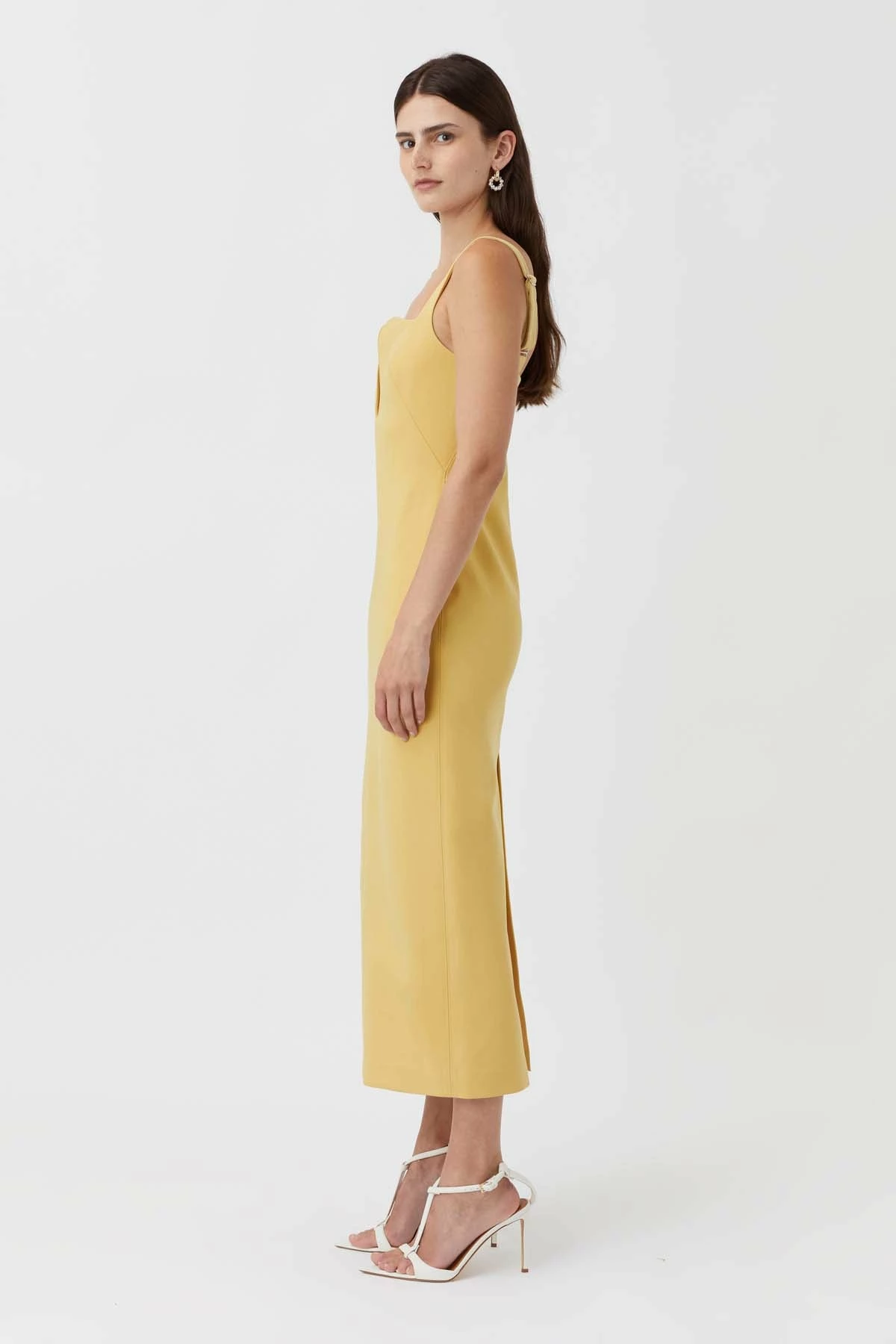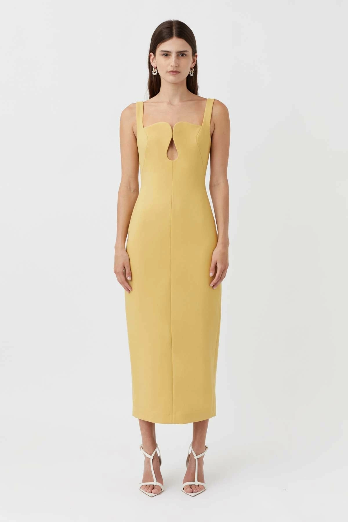 The wow dress of the season! The Camilla and Marc Brixton in Mustard Yellow. This elegantly tailored black midi dress features a curved neckline and a dramatic cut-out feature on the bust. Designed for a sleek fit, this dress features paneled shaping, a back skirt split, and adjustable straps. This classic midi dress p