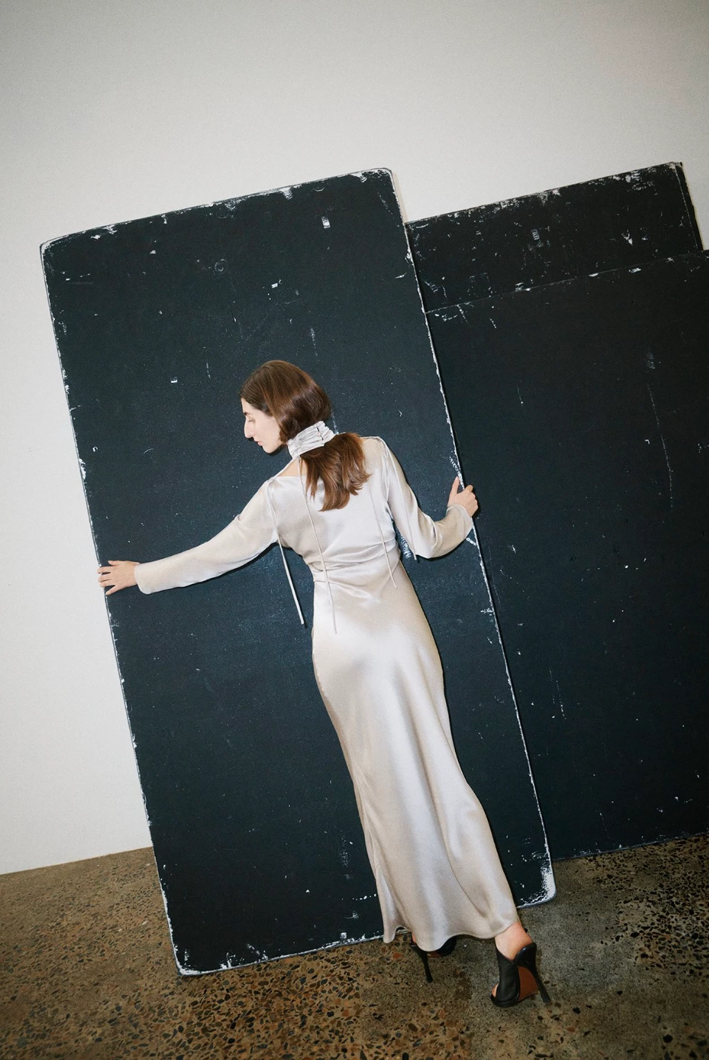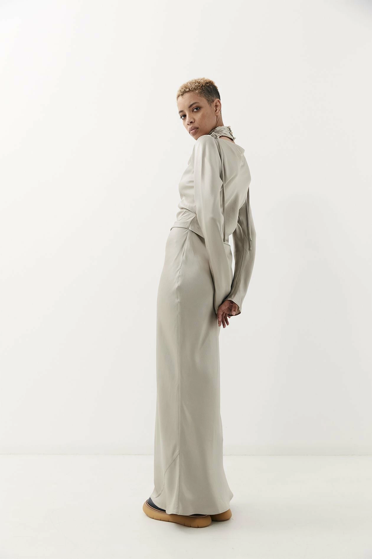 The Nikolas Dress from Harris Tapper is a bias-cut full-length dress with soft tucks at the waist to create a flattering, draped silhouette that gently contours the body. Subtle shaping over the sleeves and a softly boated neckline give an elegant approach to evening wear. This style features a detachable pleated choke