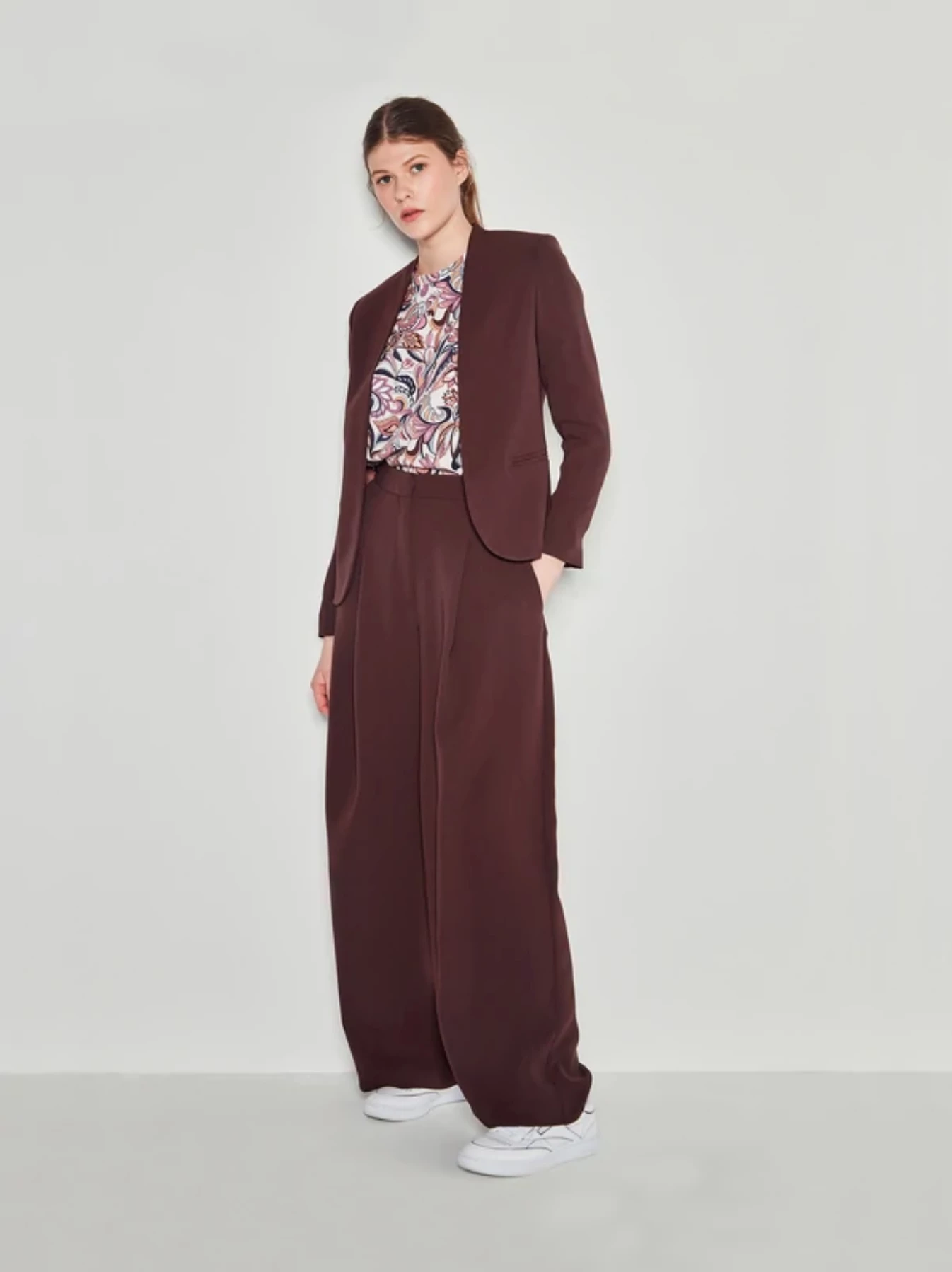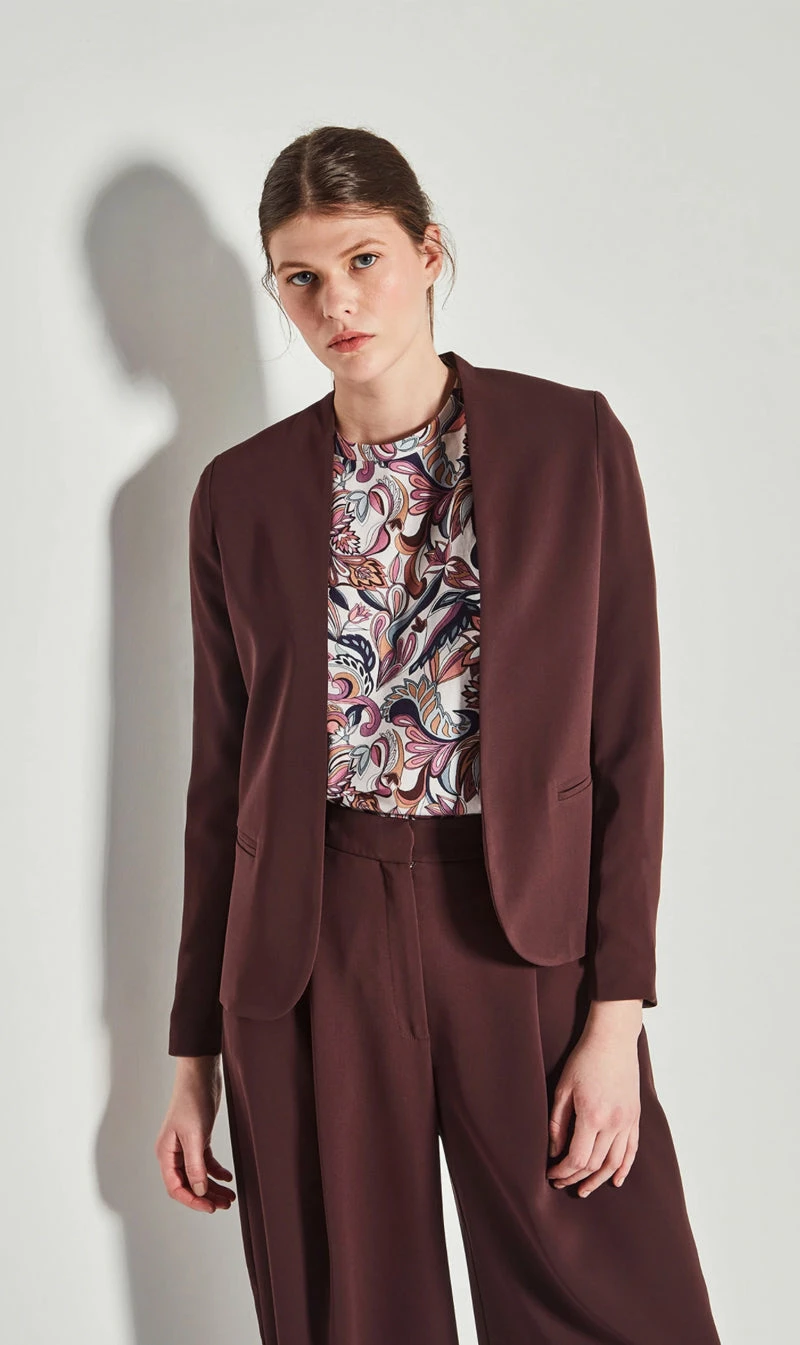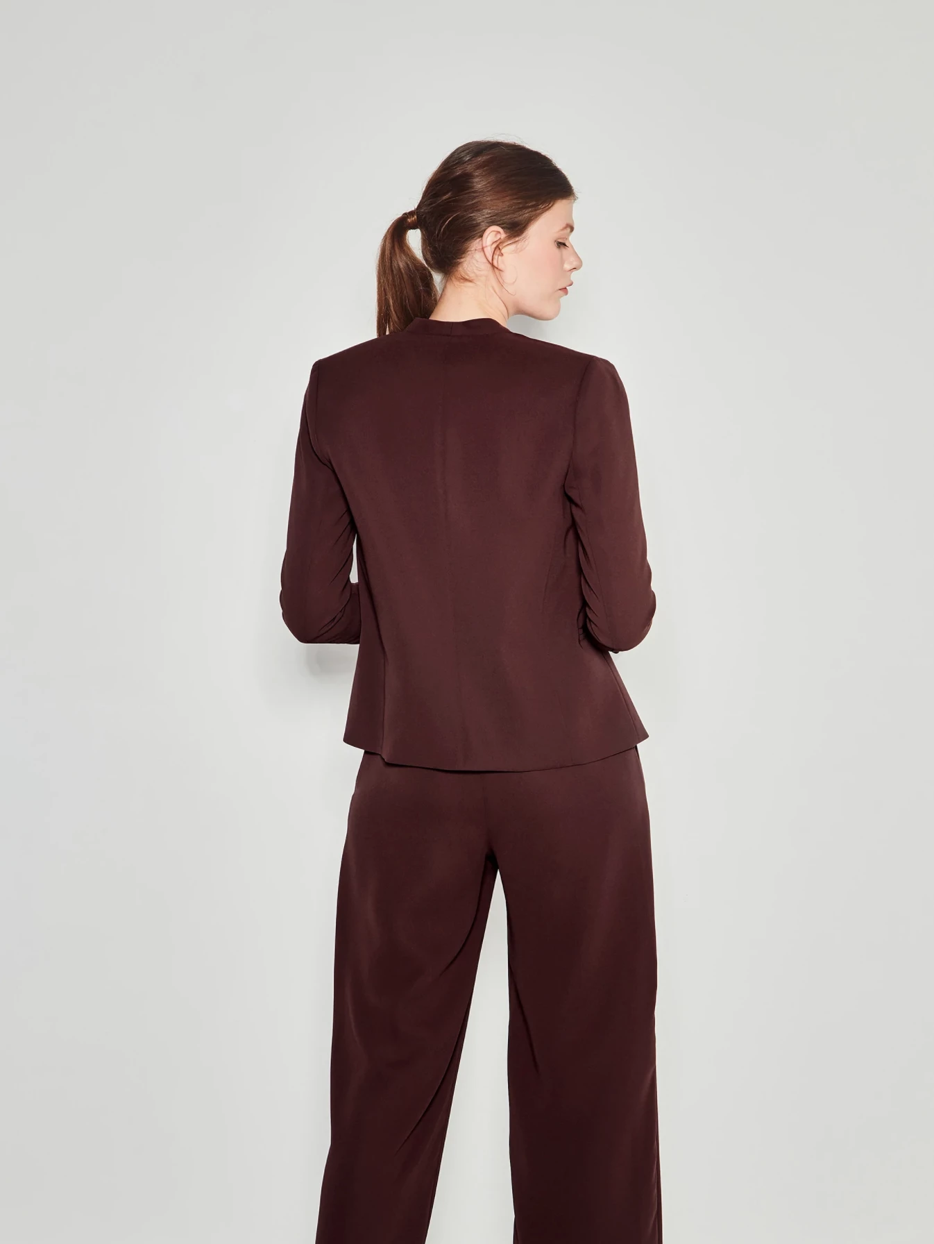 The Juliette Hogan West Blazer in Chestnut. Made in classic Luxe Suiting, the West Blazer is a versatile wardrobe staple. With its minimal design, this crisp blazer works beautifully back with a T and Jeans for simple sophistication. Crisp collarless lapel Tailored fit with a straight cut through the body Lined Bianca