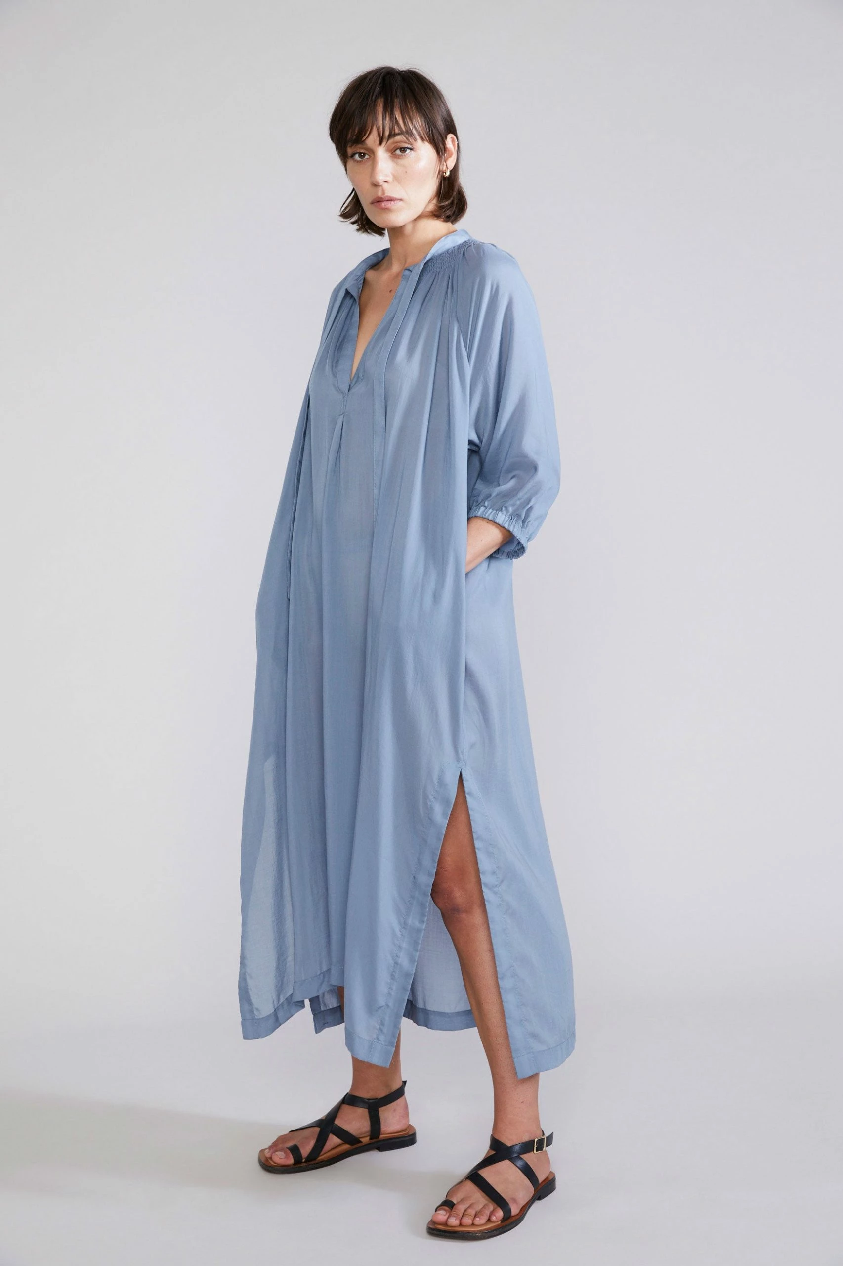 The perfect dress to slip on over the top of your swimsuit, after a shower while lounging at home, or layer with a slip as an elegant solution to relaxed summer dressing, the Laing Celeste Popover is your most versatile summer staple. With side splits and pockets with a touch of smocking around the neck for added deta