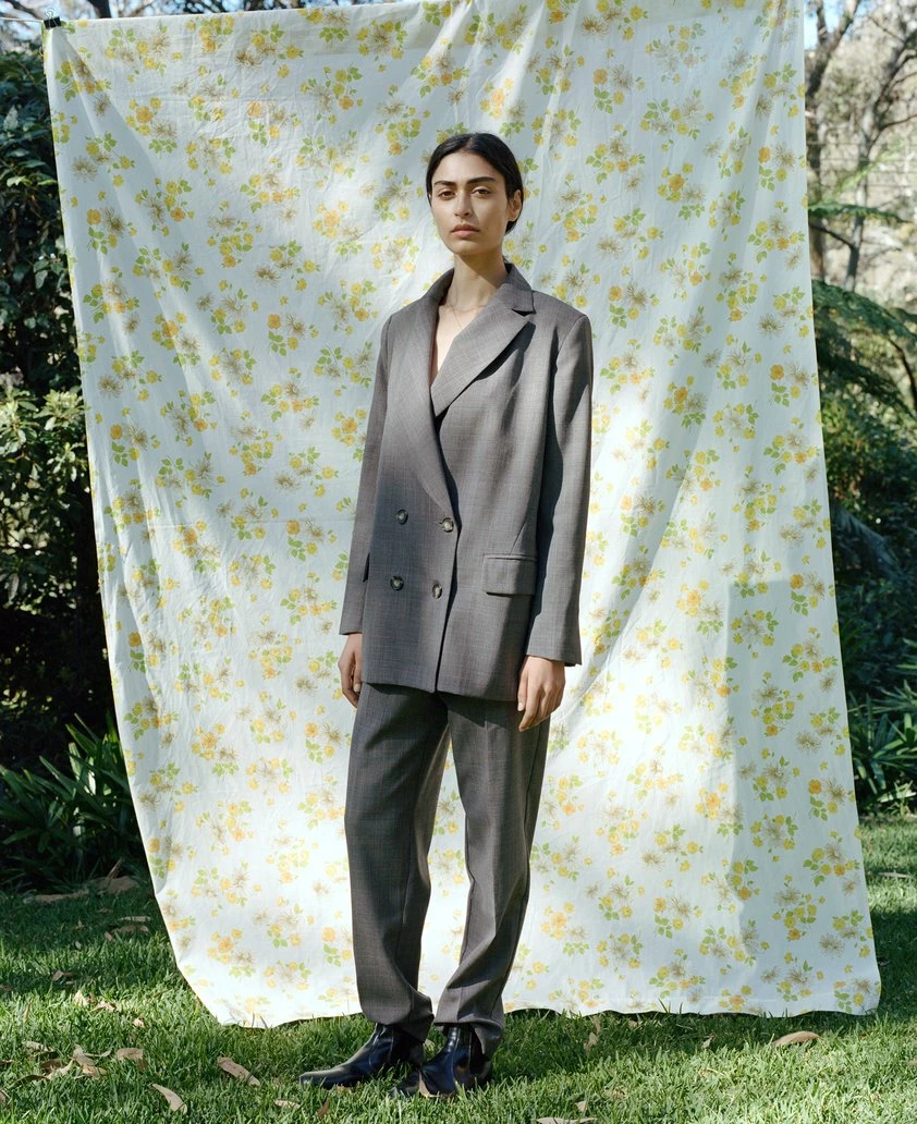 The Mahsa Gentleman Blazer: for the woman who prefers a classic masculine cut. Beautifully oversized, this timeless double-breasted jacket features tailored detailing and a softened shoulder seam. A warm yet light wool herringbone echoes the heroines in French New Wave films, and gives a generous nod to fine British su