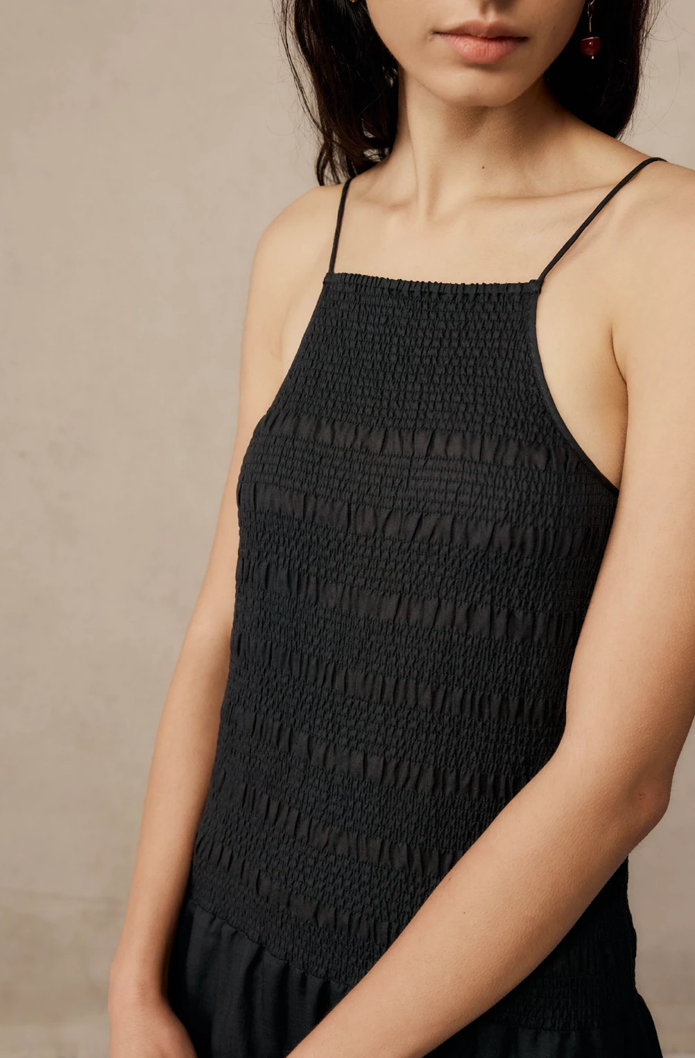 The Devyn Dress from Marle is crafted in the brand’s signature flax linen, featuring a narrow square neckline and thin rouleau straps. The top half of the Devyn Dress features a fitted form with full-body elasticated shirring which stops at the hips before falling into a full skirt. Style with some black platform sanda