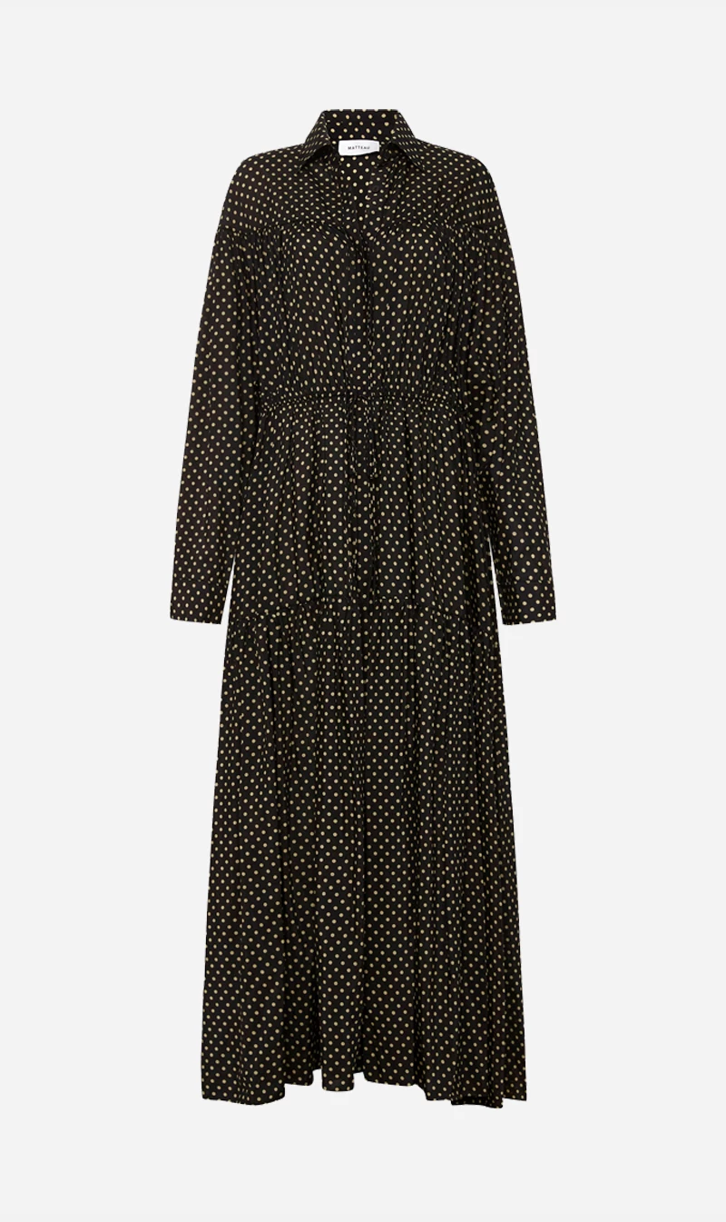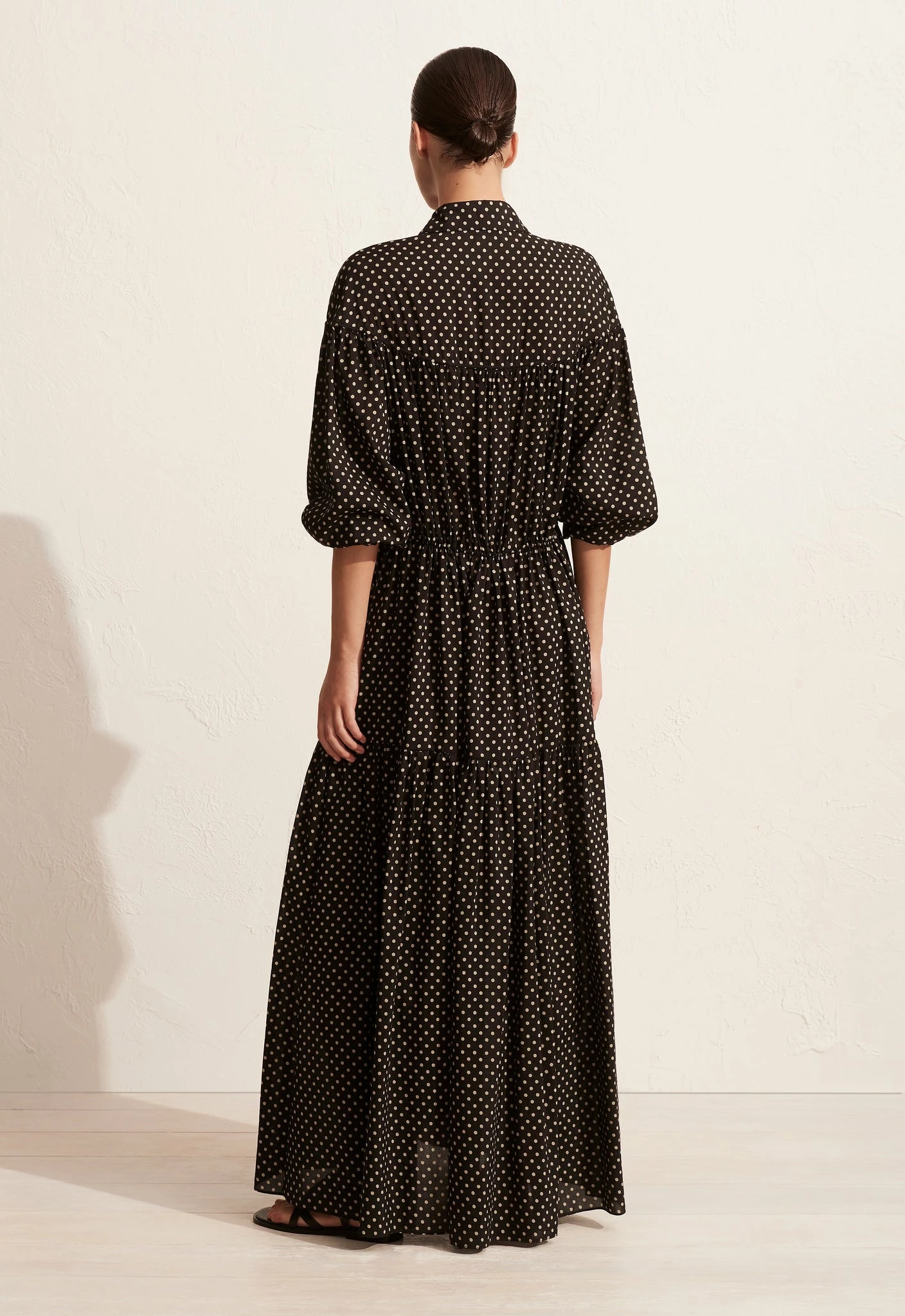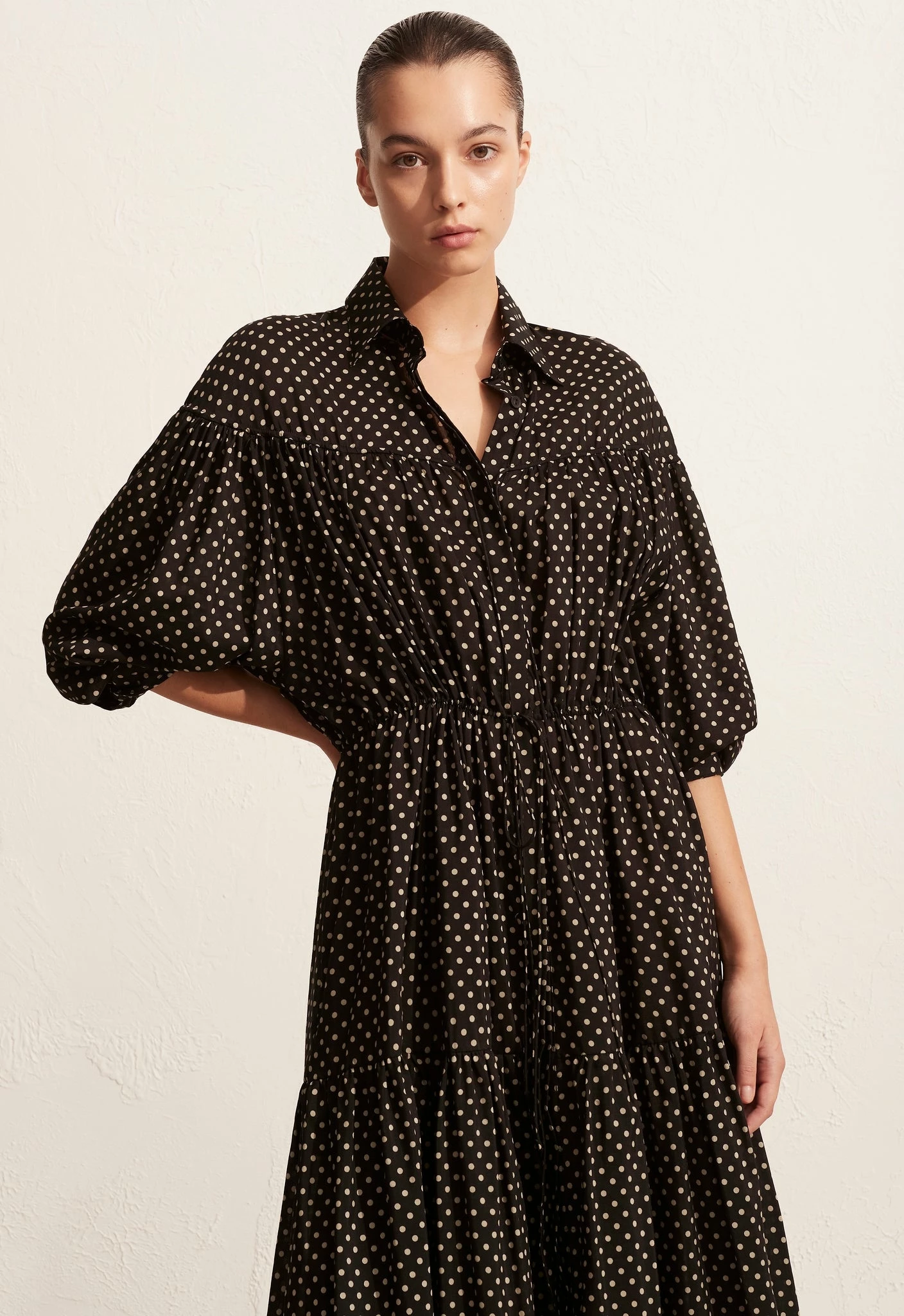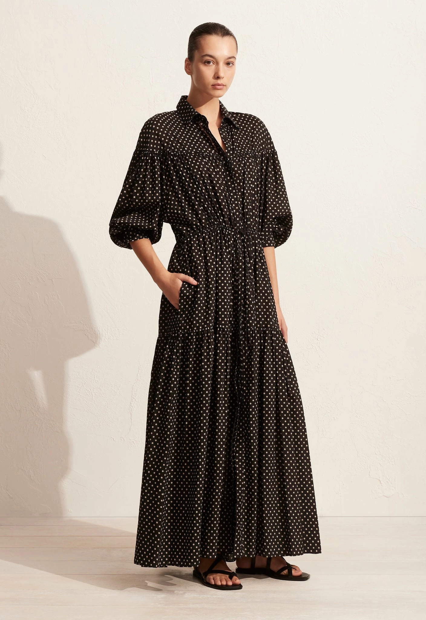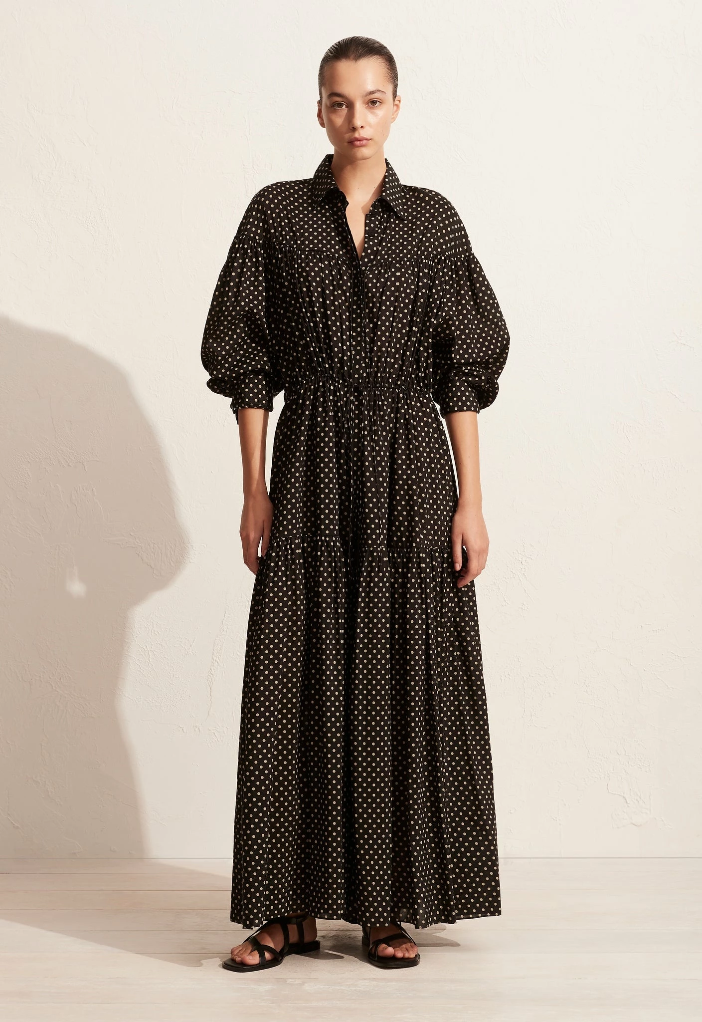 The ultimate in summer elegance, the Tiered Drawcord Dress is a voluminous and soft gathered maxi dress with traditional shirt details. Featuring a shirt-like collar and concealed button placket to hem this dress featured an adjustable drawcord with tie at yoke and waist. A relaxed fit sleeve with a button cuff complet
