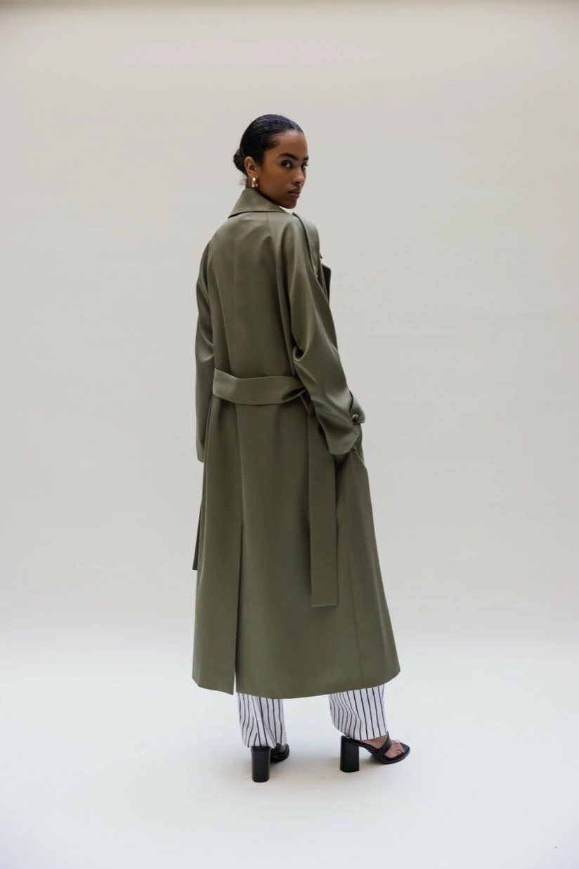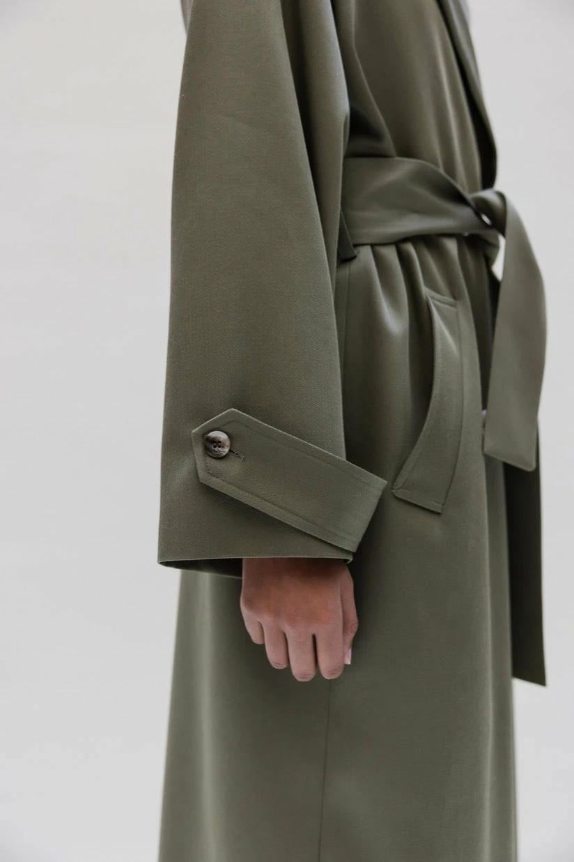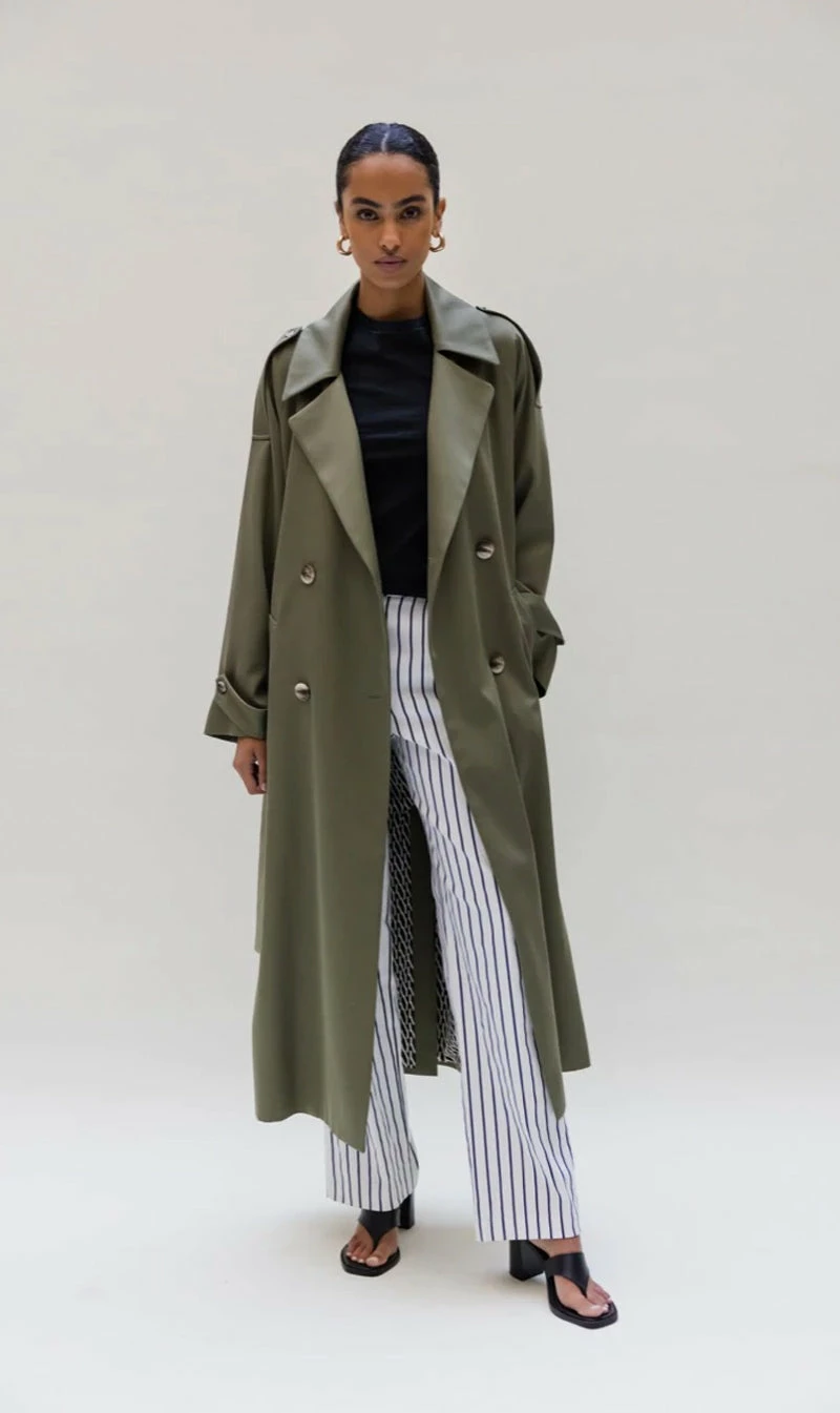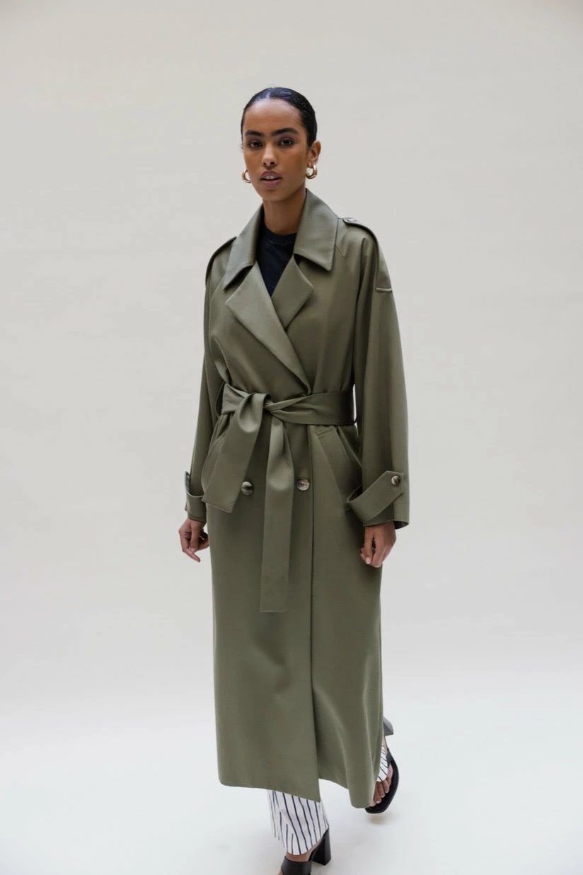 The Musier Paris Dorothee Trench in Khaki. A loose trench coat designed for a relaxed fit featuring lining with black MUSIER monogram. 70% polyester, 30% viscose. Made in France. Oversize fit. The model is 1.76m tall and wears a size 36.