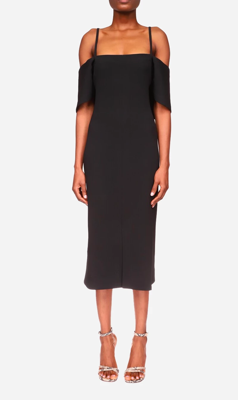 Versatile dresses are a Victoria Beckham signature and this off-the-shoulder style is no exception. In elegant black, the simple straight midi silhouette is offset by a unique off-shoulder detail; the sleeves sweep down from the arm and wrap around the back of the piece in a cape-like style. Thin spaghetti straps offer