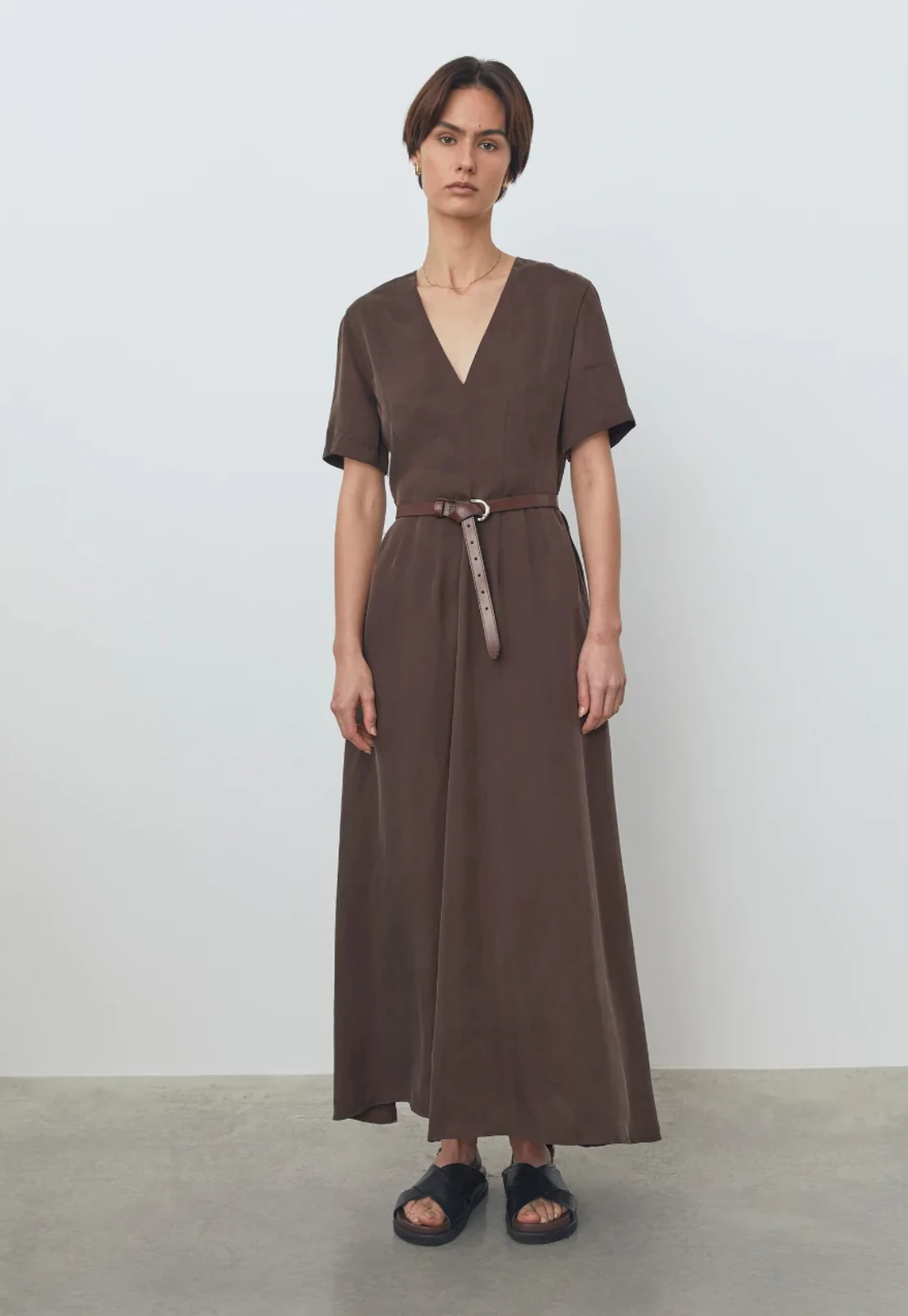 Crafted from the brand’s signature vegan silk in rich chocolate, the Yielding Dress by Viktoria And Woods offers expert draping for elevated wear. This A-line dress is designed to hit midi length and showcases a plunging V neckline, balanced with subtle set-in sleeves. With pockets at each side and a removable waist, t